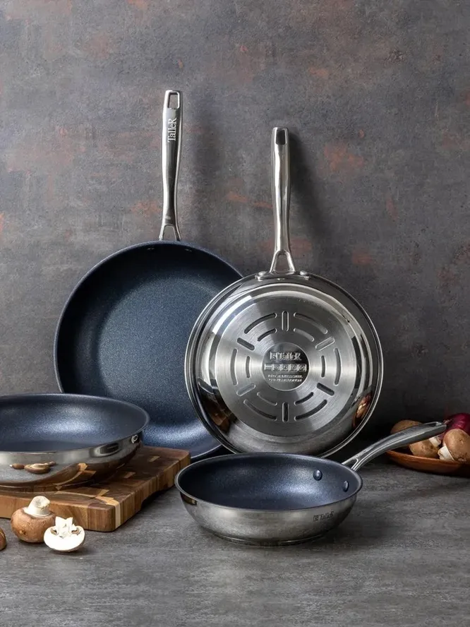 Чтобы еда прожаривалась равномерно, а сковорода быстро нагревалась и долго держала тепло, важно обратить внимание на её основу. Речь о так называемом многослойном основании или тройном дне. Это действительно важная деталь: такое дно не деформируется от высоких температур, минимизирует риск пригорания и помогает лучше контролировать процесс приготовления.