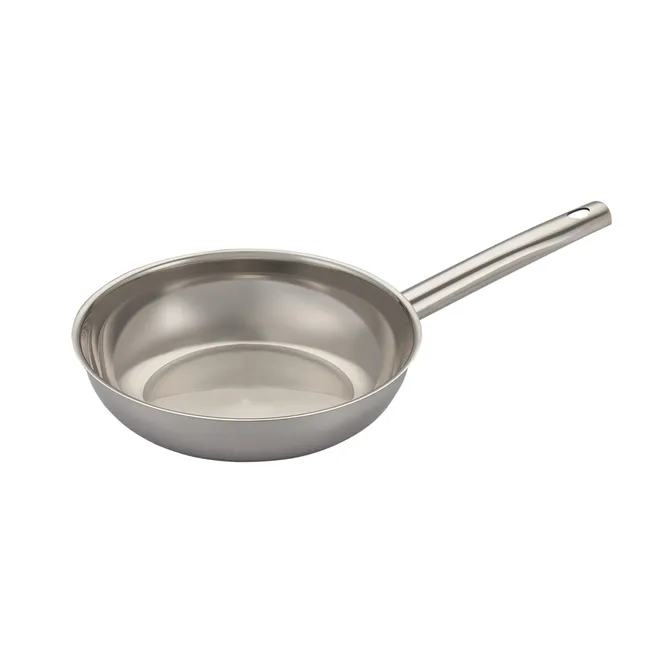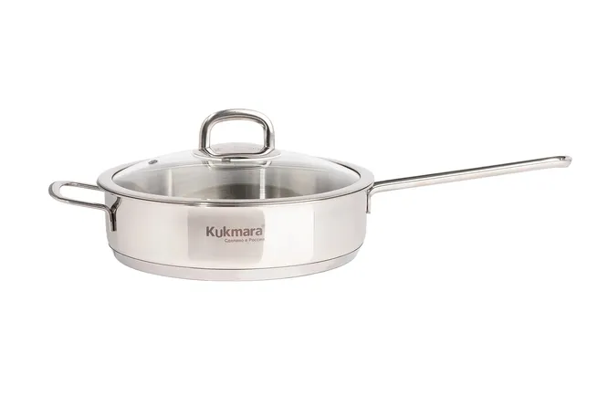 Сковорода из хромоникелевой стали 18/10 от южнокорейского концерна POSCO. Благодаря технологии холодной вытяжки, изделие отличается прочностью и равномерной толщиной стенок. Трёхслойное утолщенное дно обеспечивает быстрый нагрев и равномерное распределение тепла, предотвращая пригорание. Сковорода подходит для всех видов плит, оснащена двумя ручками и продается со стеклянной крышкой.