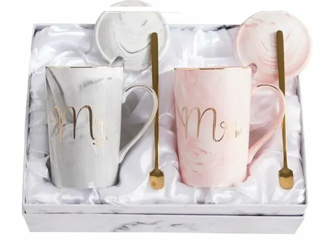- Керамические кружки с мраморным рисунком с крышкой и ложкой в красивой коробке могут стать не только презентом на гендерные праздники, но и милым дополнением к большому подарку на свадьбу или ее годовщину.