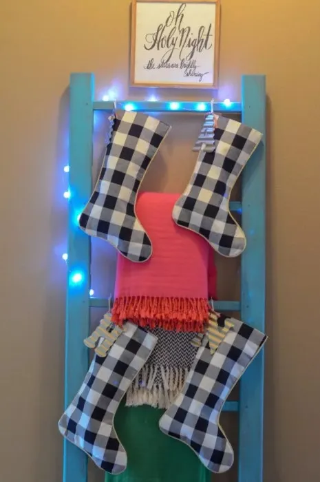 Лестницу можно использовать не только в хозяйственных целях. Превратить её в элемент праздничного декора помогут ленты и огоньки, а образ дополнят наши носки для подарков. Ну а так как лестница стоит возле стены, это также отличная идея для тех, у кого ограниченное пространство.