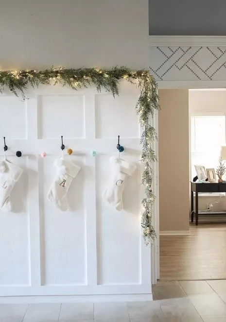Если вешалка для пальто находится рядом с входной дверью, на её крючки для пальто можно повесить носки для подарков, сделав из неё праздничное украшением.