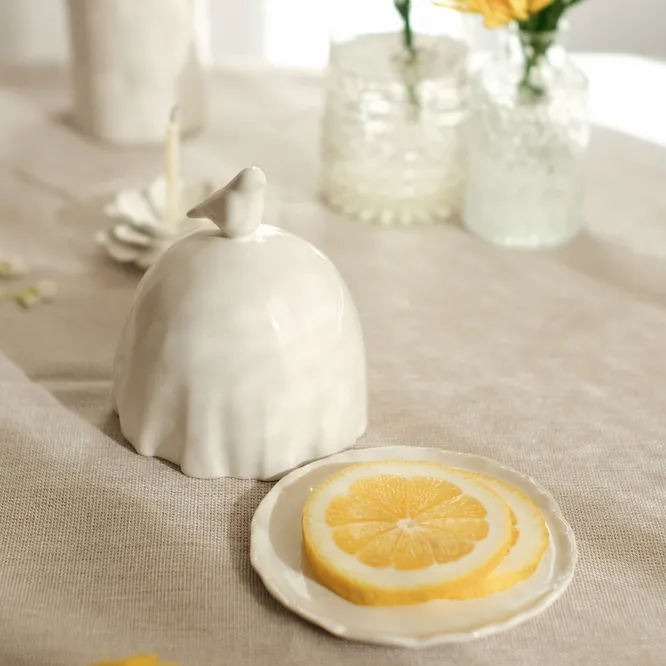 Такую симпатичную лимонницу с птичкой можно найти у московского бренда «Антикварня». Она дополнит любую сервировку и подойдёт под любой интерьер кухни. Ещё это ручная работа, которая не боится посудомоечных машин и СВЧ.
