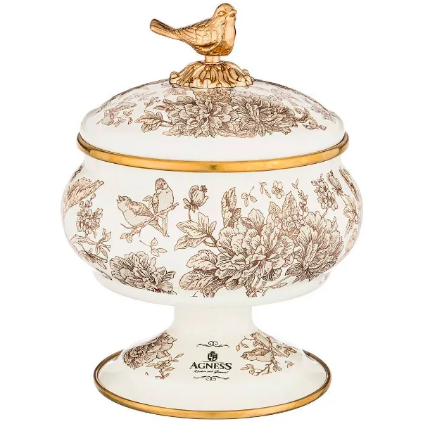 Такая сахарница подойдёт для поистине королевских приёмов и атмосферных сервировок. Помимо того, что выглядит она роскошно и празднично, изделие приподнято и стоит на ножке, а значит, на столе останется больше места для десертов, выпечки и других угощений.