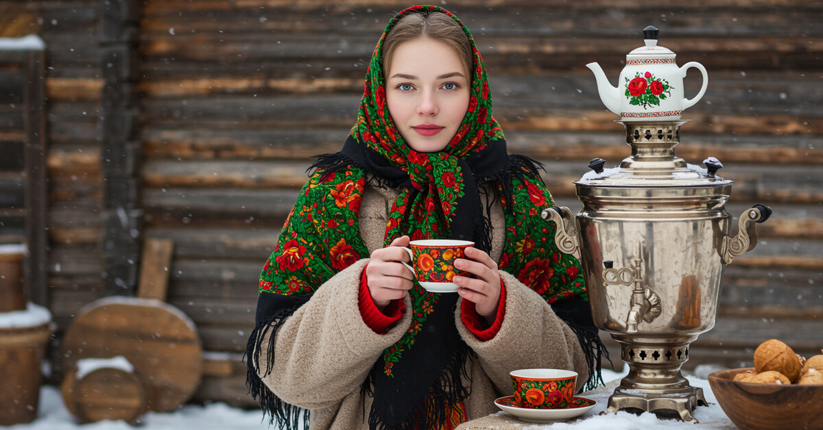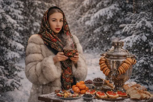 - Я нахожусь в заснеженном лесу, окружённом пушистыми елями, и стою за деревянным столом, накрытым для традиционного русского угощения. На мне роскошная большая белая шуба из натурального соболя и яркий павлопосадский платок чёрного цвета с глубокими красными, бордовыми, зелёными и золотистыми узорами. Макияж с акцентом на красной помаде.
