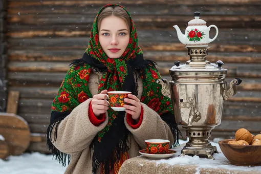 - На столе — старинный серебряный самовар со связками баранок, мандарины, русские сладости, бутерброды с красной икрой, чёрная икра в маленькой вазочке и свежий нарезанный батон.