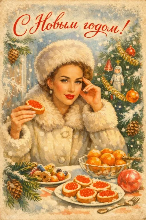 Блогер tatianaworld предложила промт для открытки в советском стиле 1950–1970-х годов. Благодаря ему можно создать вот такое изображение:
