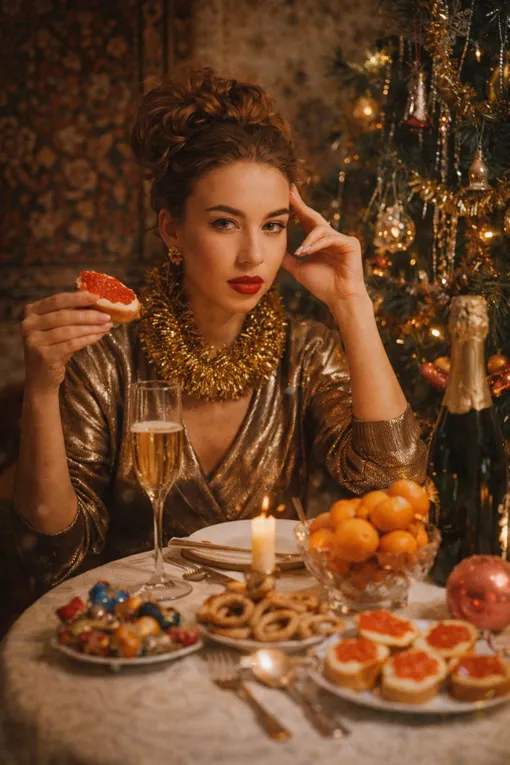 Центральная фигура за праздничным столом: верх тела, кудрявые волосы в высокой 90-х прическе, красная помада, золотисто-бронзовая блестящая блуза, золотая мишура на шее. Одна рука держит бутерброд с красной начинкой, другая опирается у головы.