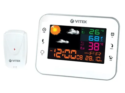 Бренд VITEK представляет беспроводную метеостанцию VT-6412, состоящую из основного блока, который располагают внутри помещения, и выносного датчика который прикрепляют к окну снаружи. Внешний датчик станции обеспечит точные данные, которые выводятся на цветной дисплей в виде яркой картинки фактической погоды, а также показателей влажности воздуха и температуры на улице. На дисплее также отображаются температура в помещении, текущее время, дата и день недели.