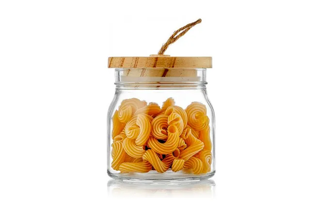 Эти стеклянные банки для сыпучих продуктов, также, как и лоток, о котором мы говорили ранее, бывают разных объемов. Сама по себе банка выглядит очень изящно и трогательно — ее приятно держать в руках, трогать. Она сделана из боросиликатного стекла, а значит, она очень легкая, но в то же время — прочная. Насыпьте в нее разноцветную чечевицу, рис или фасоль и вы увидите, как это красиво выглядит. В том, что банка прозрачная, нет ничего страшного, просто храните ее в шкафах, где у дверцы нет стекла. Так продукт дольше сохранится. У банок удобные и герметичные пробковые крышки. Это гарантирует вам, что крупа или макароны не отсыреют. И вот на что еще надо обратить внимание — конструкция крышки. Благодаря ее форме, банки можно ставить друг на друга, что помогает экономить место в шкафчике.