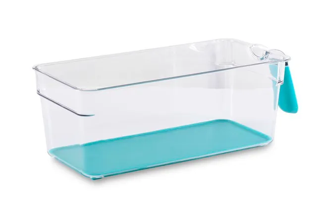 На первый взгляд – классический судочек с едой. Однако в жизни он – очень интересный: у него необычная форма, есть ручка и антискользящее покрытие, но нет крышки. Да она и не нужна. Удобная вещь, которой можно найти массу применений, но нам кажется, его лучше использовать для хранения помидоров черри, яиц или ягод в холодильнике — так они не помнутся и не побьются. Отсутствие крышки обеспечивает хорошую циркуляцию воздуха и продукты не преют в этом контейнере. И пару слов о ручке: без нее лоток не был бы таким удобным. Она также, как и дно имеет антискользящее покрытие и не выскользнет у вас из рук, даже, если они у вас в креме или мокрые.