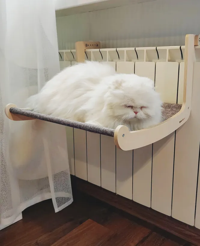 Подвесной гамак-лежанка это то, что позволит кошке почувствовать себя счастливой. Гамак изготовлен из натурального дерева, а лежанка сшита из особопрочной мебельной ткани. Гамак подойдет под любой размер радиатора, но можно подвесить и в любое другое место.
