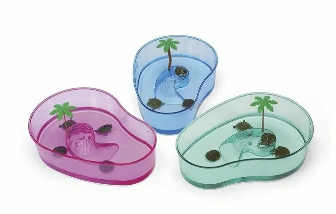 Да, мы не забыли и про них. Чтобы черепашки чувствовали себя в безопасности, подойдет пластиковый бассейн со ступеньками. На дно можно положить гальку и добавить искусственные растения и декоративные укрытия. Наполните емкость водой, оставив островок на поверхности и не забывайте регулярно чистить.