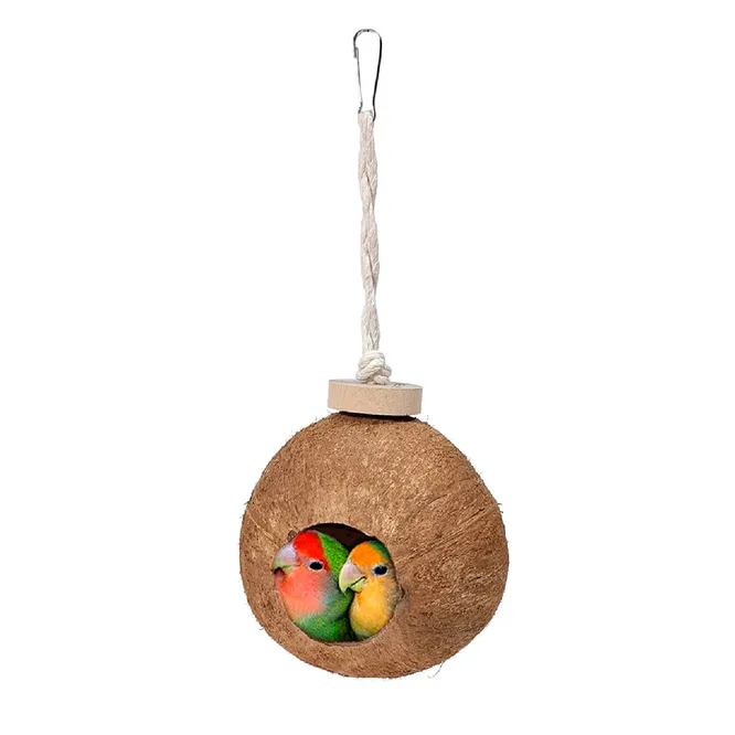 Кокосовый домик подойдет не только для попугаев, канареек и других птичек, но и для мелких грызунов. Крепится в любое место в клетке. В нём можно качаться, отдыхать, наблюдать за происходящим вокруг или разговаривать, кому-как больше нравится.