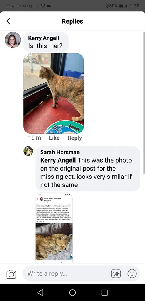 Вскоре Тэш получила первое известие: некая Керри Энджелл видела похожую кошку в городском автобусе. Это показалось ей забавным, и она сделала несколько фотографий пушистой путешественницы. После этого Тэш стали приходить сообщения от разных людей, по которым хозяйка смогла собрать воедино историю исчезновения ПС.