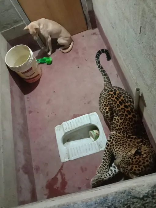Никто толком и не понял, как все произошло. По свидетельству очевидцев, в открытую дверь жилого дома в индийском селе Билинеле штата Карнатака вдруг влетела дворовая собака по кличке Боллу, а за ней – леопард. Оба ринулись в ванную комнату, где их закрыли испуганные хозяева. Только спустя несколько часов на место происшествия прибыли сотрудники департамента лесного хозяйства. Они стали разбирать крышу в ванной, на всякий случай накинув на здание сетку, а затем просунули в отверстие камеру, чтобы посмотреть, что происходит внутри комнаты.