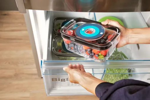 Главная особенность новых холодильников Bosch VarioStyle — технология VitaFresh. В специальных зонах свежести VitaFresh овощи и фрукты дольше сохраняются свежими.
