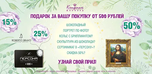 А проходящая сейчас акция – отличная возможность увеличить количество подарков. При приобретении сладостей «Конфаэль» на сумму 500 и более рублей покупатель получает подарочную карту, на которой под скретч-полосой он обнаружит сообщение о подарке за покупку. Это будет шоколадный портрет по фото, колье с бриллиантом RobertoBravo, скульптура из шоколада, сертификат в салон красоты «Персона»или персональная скидка на следующую покупку 15, 25 или 50 %.