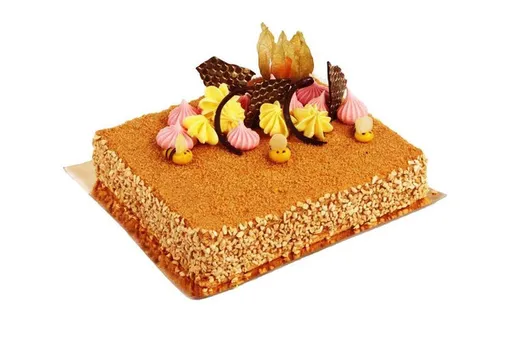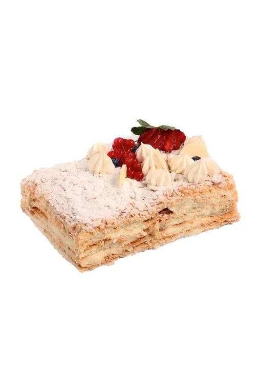 В «Бруснике» этот торт занимает почетное место и выполняется по классической рецептуре на основе слоеного теста и нежного заварного крема. Праздничный вариант дополнен свежими ягодами – клубникой, голубикой и смородиной.