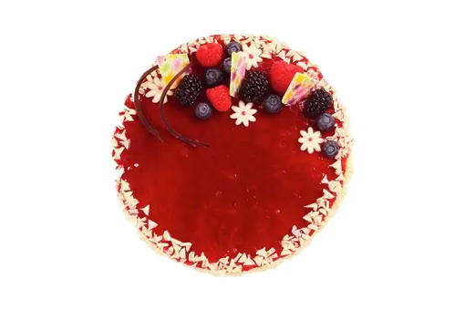 Насыщенный ягодный вкус и нежная сливочная основа – встречайте аппетитный малиновый чизкейк! Украшение из свежей малины, ежевики, голубики и стружки из белого шоколада делает торт по-настоящему нарядным.