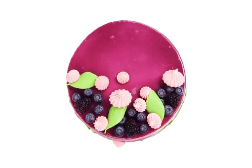 Самая вкусная новинка! Пышный бисквит, покрытый ягодным гляссажем и восхитительная начинка из воздушного йогуртового мусса с черникой. Украшен безе, свежими ягодами и шоколадной глазурью.