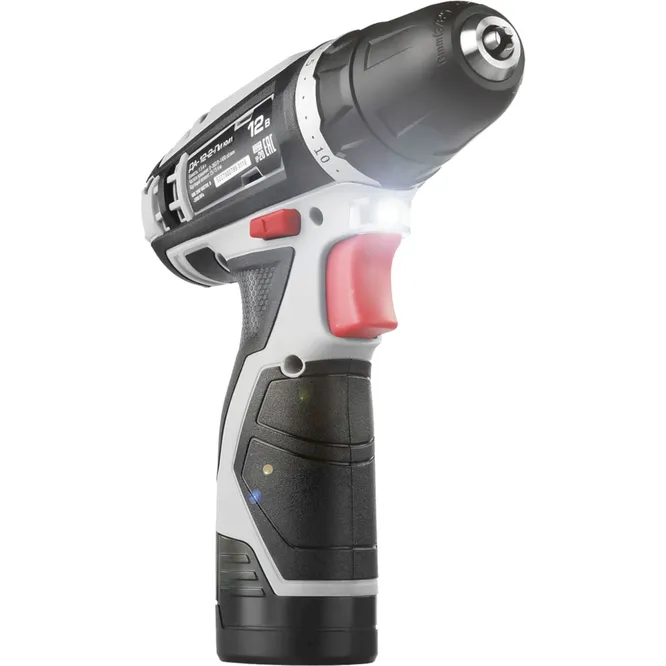 Аккумуляторный шуруповёрт с напряжением 12 В и двумя скоростями. Обладает компактным корпусом и функцией быстрого зажима патрона. Ёмкость аккумулятора 1,3 Ач, достаточно для небольших бытовых задач. Есть подсветка для работы в тёмных местах.
