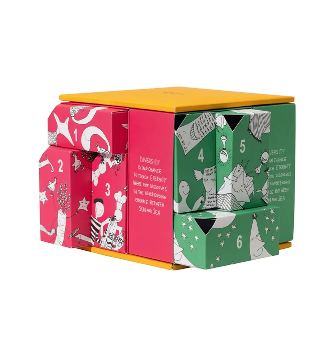 «Открой для себя мир наслаждений» — девиз косметического адвент-календаря 2025 года, дополнившего коллекцию Holiday. Отличительная черта её дизайна — стиль ретро 70-х годов, полный ярких красок, радости и безграничной свободы. В центре композиции — оливковое дерево, символ Прованса, дающего жизнь фирменным ингредиентам в составе продукции бренда: цветам апельсина, миндалю, маслу ши, лепесткам роз и плодам персика. За окошками прячутся 24 средства в миниатюрах и вполне приличном объёме до 75 мл. Наслаждение растянется на месяцы!
