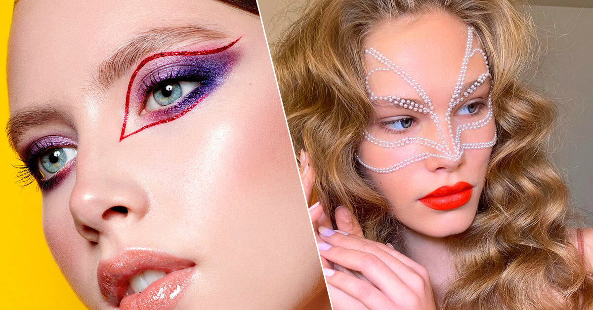 Ещё один необычный способ создать ослепительный образ – добавить в свой макияж декоративные элементы. Это могут быть блёстки, стразы, жемчужины, перья. Тут главное не переборщить и выбрать что-то одно. Располагайте такой декор на вашем лице, как только пожелаете: хаотично или выкладывая узоры, дополняя другие части мэйкапа или используя только эти украшения.
