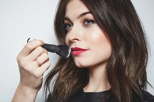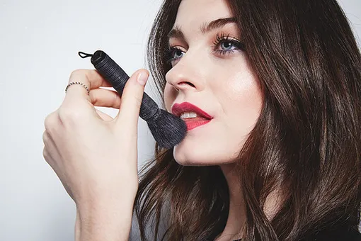 С помощью объемной кисти нанесите на всю поверхность губ рассыпчатую пудру. Немного «повбивайте» ее в губы кончиками пальцев.