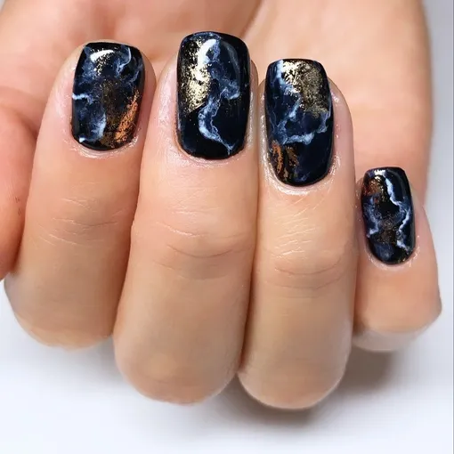Мраморный маникюр в чёрных оттенках выглядит одновременно дорого, стильно и элегантно. Дополнить его можно тонкими золотыми жилами — они добавят роскоши.