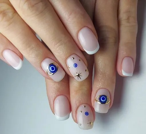 Для тех, у кого короткие и хрупкие ногти, мастера советуют акриловый френч. Наносим на пластины нежно-розовую основу и рисуем маленькие синие «глазки» на каждом пальце. Ну а чтобы дизайн выглядел более эффектно, ноготь среднего пальца можно покрасить в сине-голубом цвете и добавить золотые акценты.