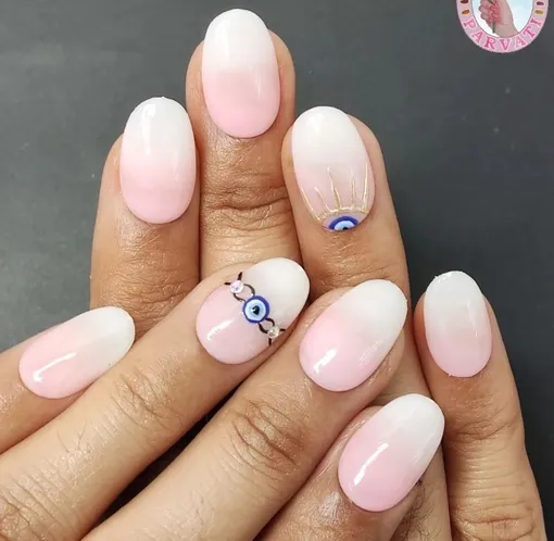 Романтическим особам нейл-мастера рекомендуют дизайн в стиле Барби. Нежный пастельно-розовый оттенок смотрится очень женственно, а «Глаз Фатимы» придаст образу магию.