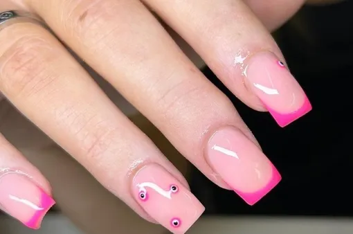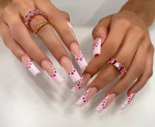 Обладатели длинных ногтей могут смело давать волю своей фантазии и экспериментировать с дизайном. Например, сделать френч с толстыми розовыми кончиками, на которых можно нарисовать целый хоровод крошечных синих глазок.