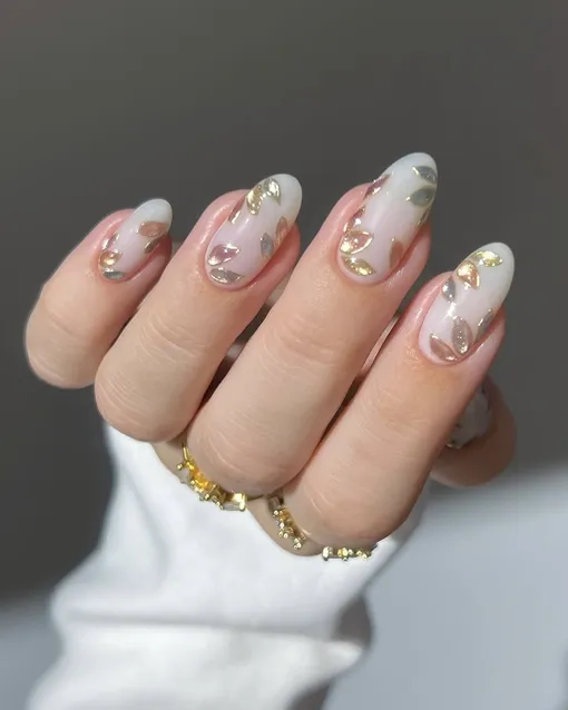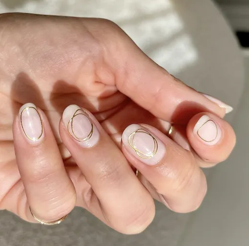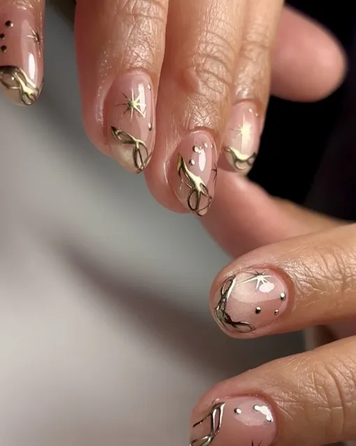 Сделайте нюдовый маникюр и добавьте золотые акценты. Это могут быть линии, веточки: цветы или звезды.