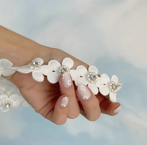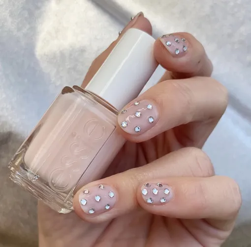 Любите стразы? Мы тоже! Именно поэтому так рады, что маникюр со стразами — еще один свадебный тренд 2025. Вы можете сделать из камушков дорожку вдоль ногтя, составить узор или хаотично расположить их на ложе, как на фото.