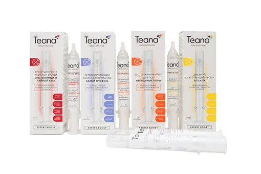 Teana разработала принципиально новую концепцию ухода за кожей – инновационную линейку бустеров, Teana Expert Boost. В серии представлены 18 уникальных бустеров для лица и каждый из них содержит высокоактивные косметические ингредиенты нового поколения. Бустеры Expert Boost позволяют получить от любого косметического средства и программы ухода в целом — максимум пользы. Это происходит за счет быстрого «проталкивания» глубоко в кожу активных ингредиентов и позволяет достичь феноменального эффекта, максимально близкого к салонной косметологии (инъекциям, лазерному омоложения и пр.).
