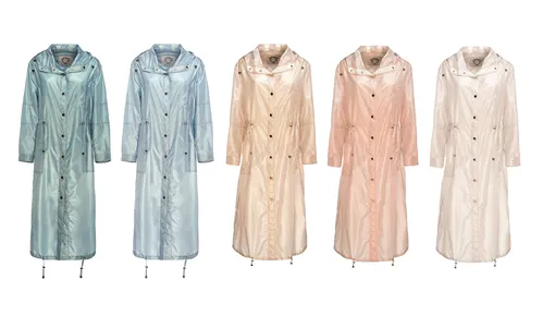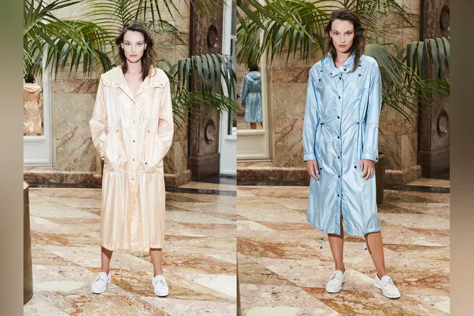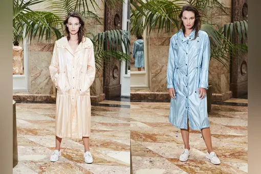 Цветовая гамма капсулы варьируется от нежно-голубого оттенка и тиффани до персикового и сливочного. Этот ультра-стильный предмет одежды, в котором будет очень комфортно, а если подвязать нижние края и затянуть технические завязки на талии, то она может превратится в куртку.