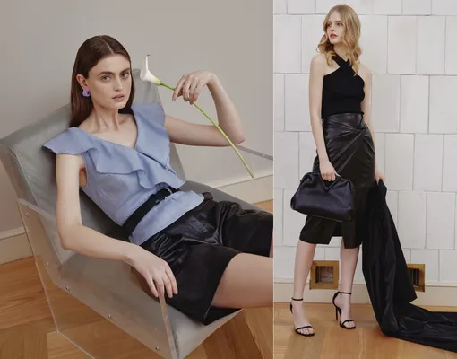 Для любителей total leather look представлены пиджаки и жакеты, юбки и платья с драпировкой, шорты-бермуды и широкие брюки с высокой посадкой из натуральной кожи, которые отлично рифмуются между собой как по дизайну, так и по цветовой гамме. В рамках устойчивого тренда на тейлоринг, в коллекции присутствуют костюмные пиджаки и брюки.