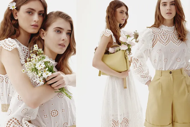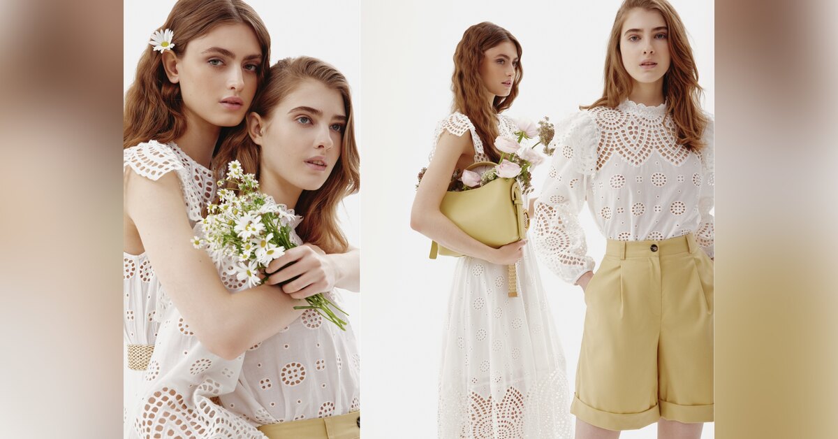 В летнюю часть вошли блузы и платья из хлопка и льна нежных оттенков, акцентные кроп-топы из эластичного трикотажа с фактурным плетением, юбки-трапеции, джинсы с вырезами и сарафаны с открытой спиной и шнуровкой, подчеркивающими силуэт и созданные для романтичного настроения. Для ярких и выразительных образов пастельная гамма коллекции дополнена сочными оттенками желтого и цвета фуксии.
