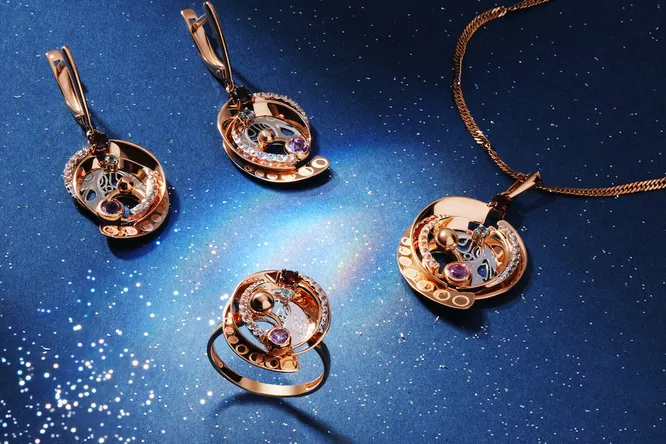 Многоуровневые подвески, серьги, кольца с уникальными рисунками солнечной системы представлены в виде двух оттенков золота 585 пробы и декорированы россыпью топазов, аметистов и гранатов.