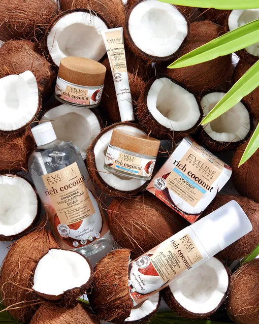 Но на лицо чистое масло мы наносить не советуем. Тем более, когда есть готовое решение – серия косметических средств Rich Coconut от Eveline Cosmetics с кокосом.