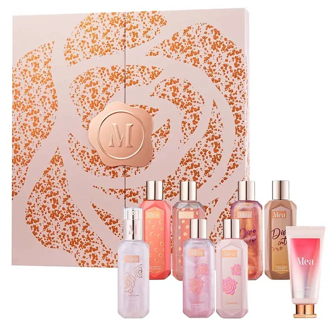 В новогоднем адвент-календаре российского парфюмерного бренда MEA есть всё для домашнего спа: благоухающие гели для душа, молочко, спрей для тела, крем для рук. Сюрпризов немного — всего восемь, но объём флаконов хороший — 50 и 100 миллилитров. Если открывать раз в несколько дней, подарков хватит до самой новогодней ночи.