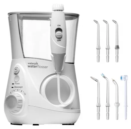 Благодаря тонкой и сильной струе воды этот стационарный ирригатор эффективно удаляет остатки пищи, налёт, а также массажирует дёсны. Устройство предоставляет 10 режимов работы. В комплекте идут 8 насадок: для ортодонтических конструкций, для чистки языка, для удаления налёта в зубодесневых карманах и зубного камня, насадка с щёточкой и вращающаяся зубная щётка. Насадки можно хранить специальном контейнере, который также является крышкой резервуара для воды. Объём резервуара: 600 мл. Этот ирригатор для полости рта подходит людям с ортодонтическими конструкциями, для профилактики кариеса и тщательного ухода за зубами и дёснами.