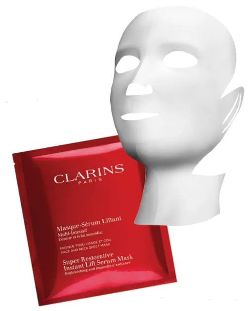 Как влитая садится на кожу и маска Multi-Intensif, Clarins, пропитанная сывороткой. Это обеспечивают прорези для ушей и удлиненные нижние концы, которые нужно закрепить за шеей.