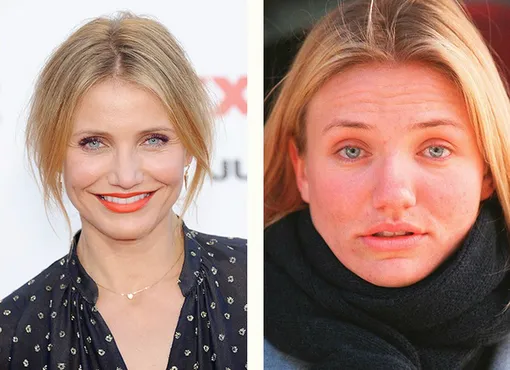 Камерон Диаз всю жизнь борется со своей проблемной кожей — времена юношеских прыщиков давно остались позади, но акне не покинуло звезду до сих пор. Справляется только тональный крем — его Камерон всегда носит толстым слоем.
