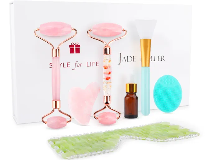 В этом наборе есть всё, что нужно для проведения бьюти-ритуала: целых два массажных роллера, скребок в форме сердца из розового кварца, пузырёк для хранения массажного масла с удобным капельным дозатором, массажёр для предварительного очищения лица, кисточка для нанесения крема и даже маска для глаз из нефритового камня, которую можно по желанию охладить или нагреть под струей воды. Кстати, маску можно использовать не только для глаза, но и для шеи, рук, декольте и спины.