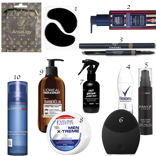 1. Лифтинг-патчи с углем бамбука для кожи вокруг глаз, AnsaLigy for MEN 2. Гиалуроновый гель для душа, Librederm for men 3. Карандаш для бровей Boy De Chanel 4. Антиперспирант «Термозащита», Rexona 5. Антивозрастной флюид, Payot Homme 6. Звуковая щетка «3 в 1» для очистки кожи лица LUNA 2 for MEN, Foreo 7. Спрей для тела, Lush 8. Успокаивающий ультраувлажняющий крем Men X-treme, Eveline Cosmetics 9. Очищающий гель для бороды, лица, волос, L’Oréal Men Expert 10. Увлажняющий бальзам, Clarins Men
