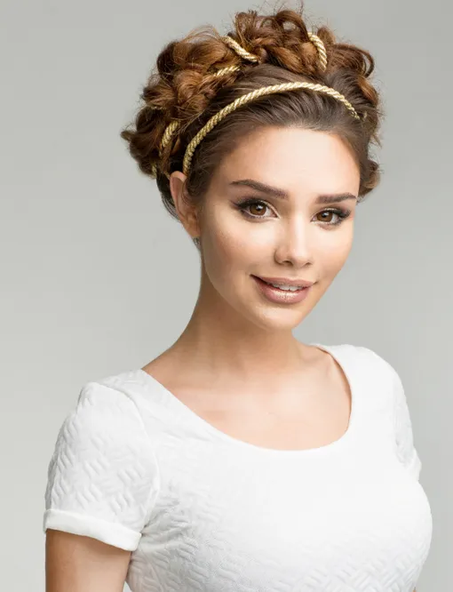 «Роскошь Востока, но в современном прочтении! Для тренда Byzantime характерны сложные линии, которые можно создать за счет жгутов, кос и других элементов, выполненных из волос. Также актуальны аксессуары, которые могут быть вплетены в волосы».