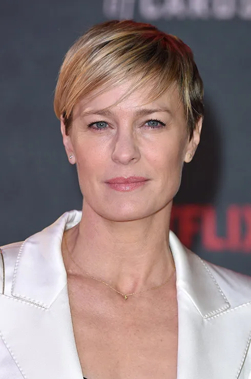 Звезда «Карточного домика» появлялась в сериале с разной длиной волос, но наш любимый лук, конечно же, тот, когда Робин Райт коротко подстриглась. Идеальная гладкая пикси добавила образу сдержанности и серьезности и при этом «забрала» пару лет. Актрисе очень подходит эта прическа!
