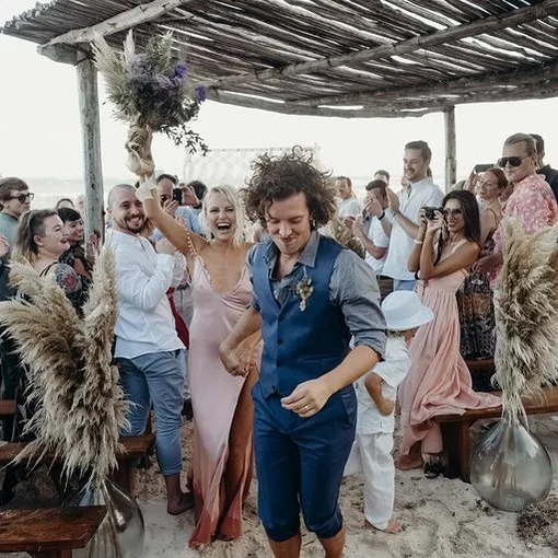 Еще одно розовое свадебное платье — у актрисы Малин Акерман. Правда — это платье уже с совсем другим характером. Шелковая сорочка в стиле бохо-шик и отсутствие обуви — ведь церемония бракосочетания проходила прямо на пляже.