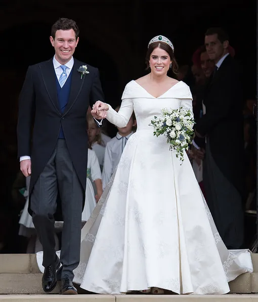 Еще одна королевская свадьба — бракосочетание принцессы Евгении Йоркской. Ее свадебный наряд V-образным вырезом был декорирован большим отложными деталями и драпировками по лифу платья. А изумруды в тиаре красиво сочетались с обилием зеленых ветвей и листьев в букете невесты.